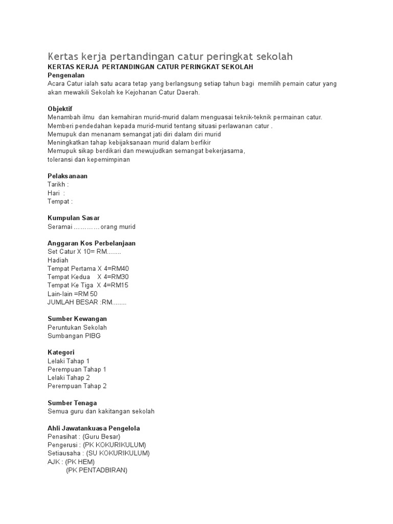 25-26 oktober 2013 anjuran. Kertas Kerja Pertandingan Catur Kertas Kerja Kejohanan Sukan Olahraga bagi acara padang dan balapan peringkat sekolah. Kertas kerja pertandingan mencungkil bakat murid 2018 1.
